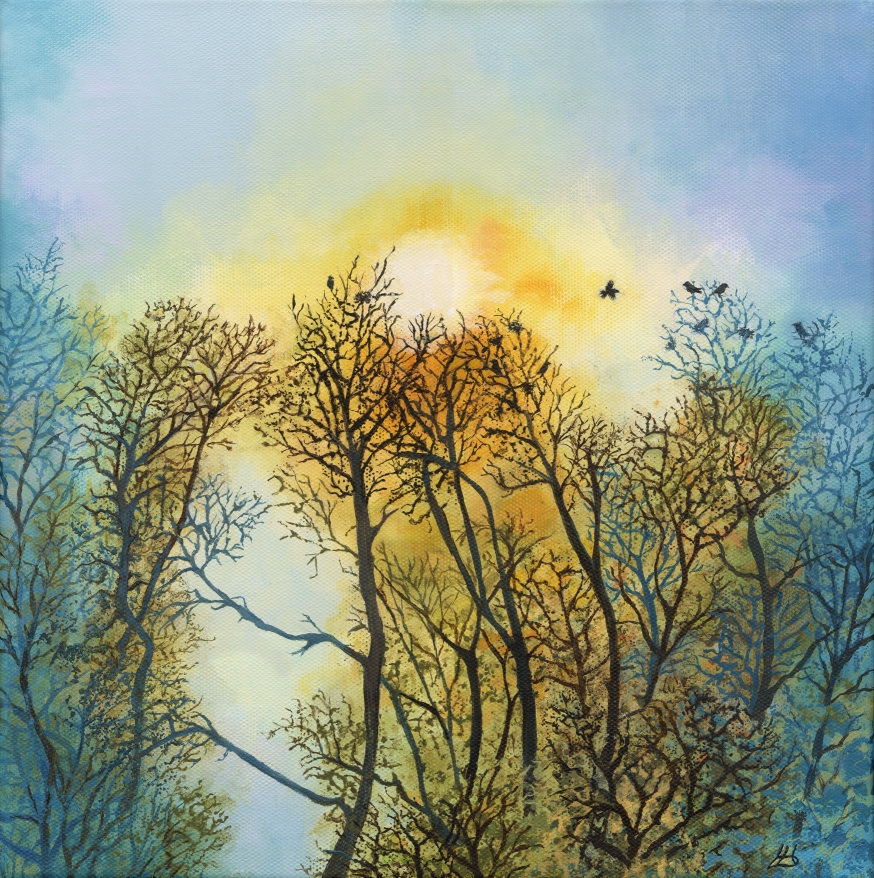 I love the glowing light through tree branches on a sunset horizon, so this is a second painting of mine exploring this. A photograph of a field close to where I live taken on a misty snow-covered wintry day was the inspiration.